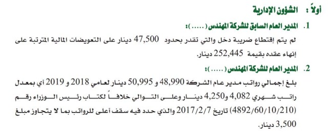 كما كشف التقرير عن عدم اقتطاع ضريبة الدخل لمدير عام سابق لذات الشركة الحكومية تقدر بنحو 47 ألفا و500 دينار، على التعويضات المالية المترتبة على انهاء عقده بقيمة 252 ألفا و445 دينارا.